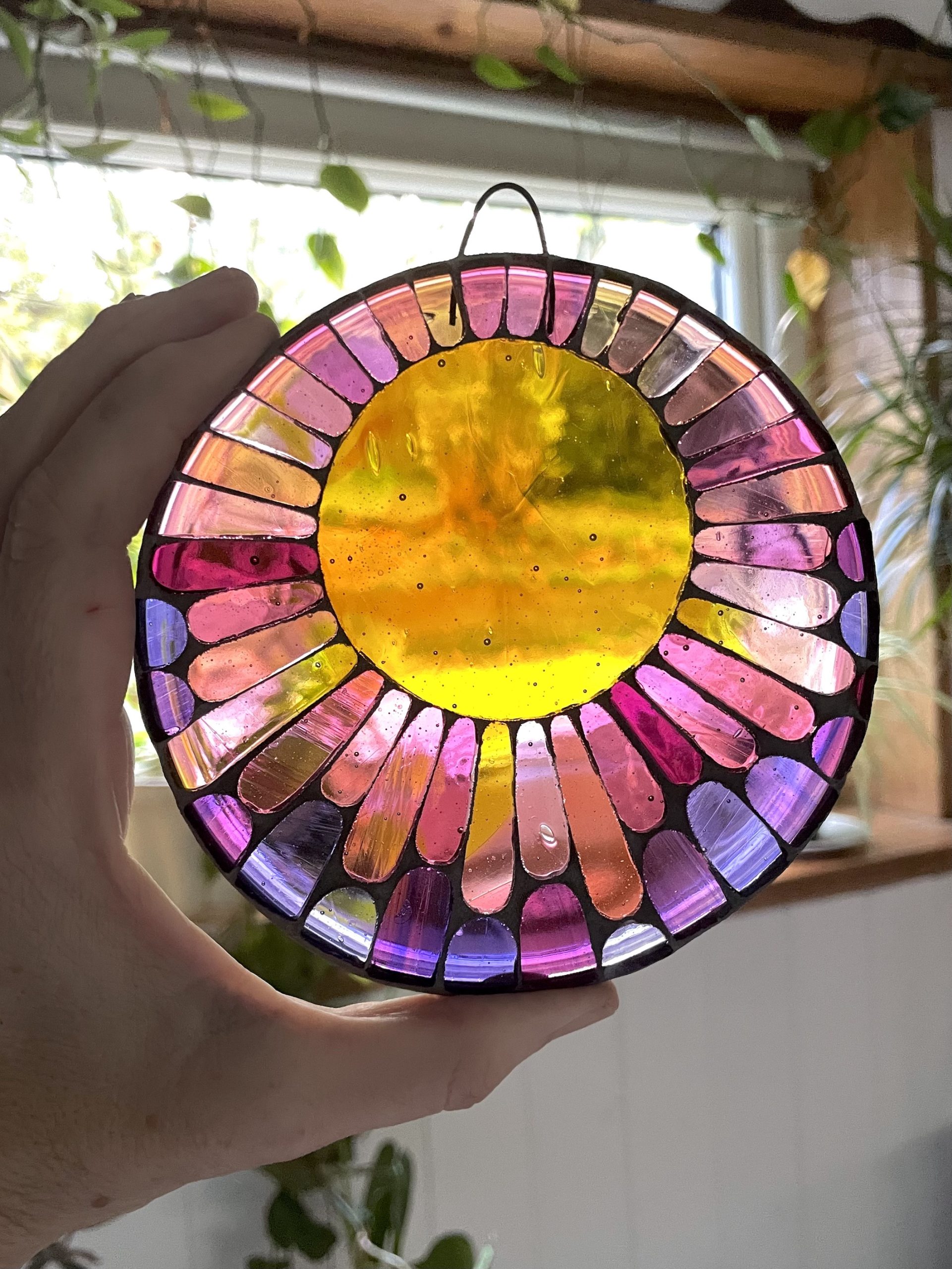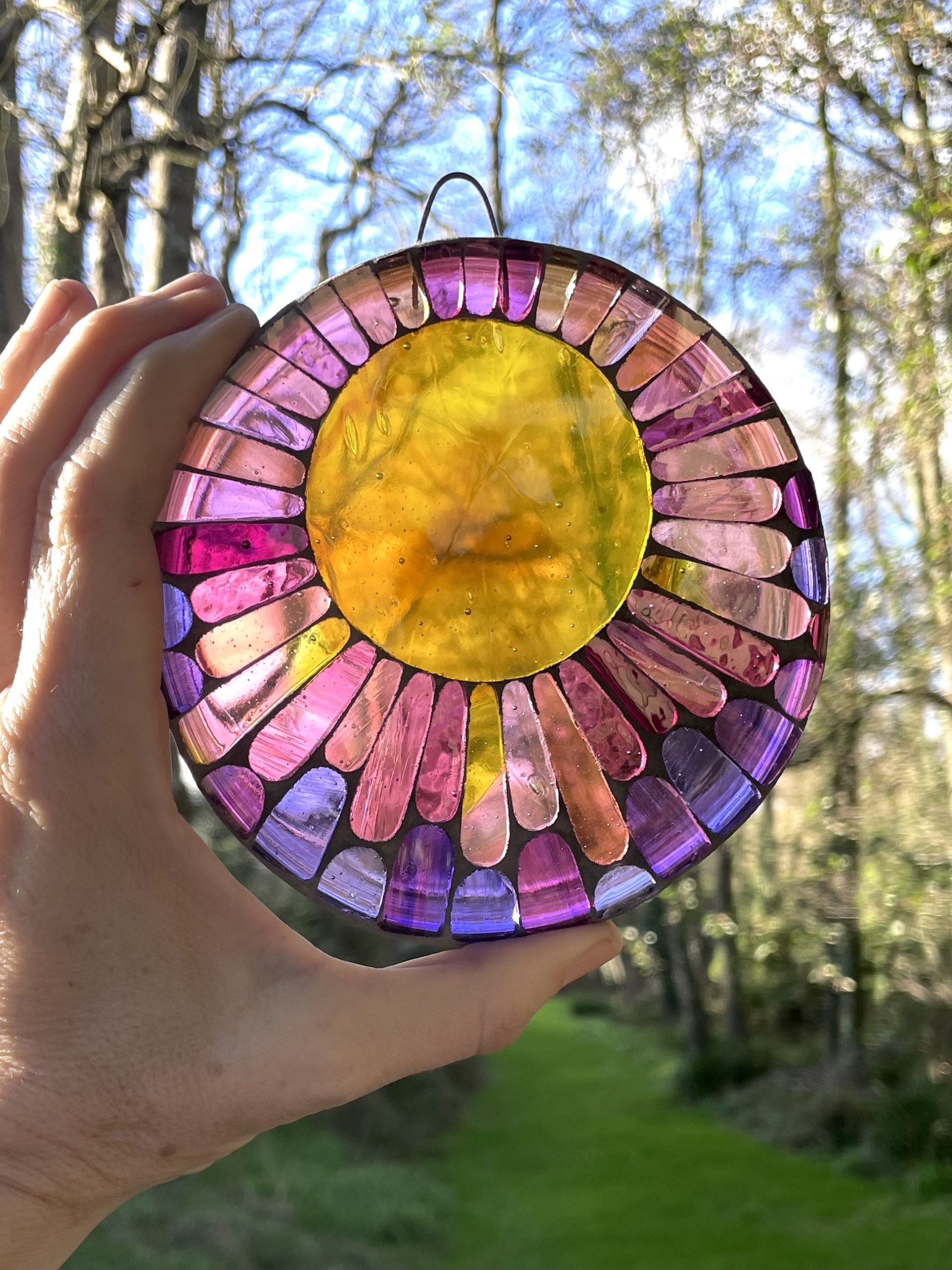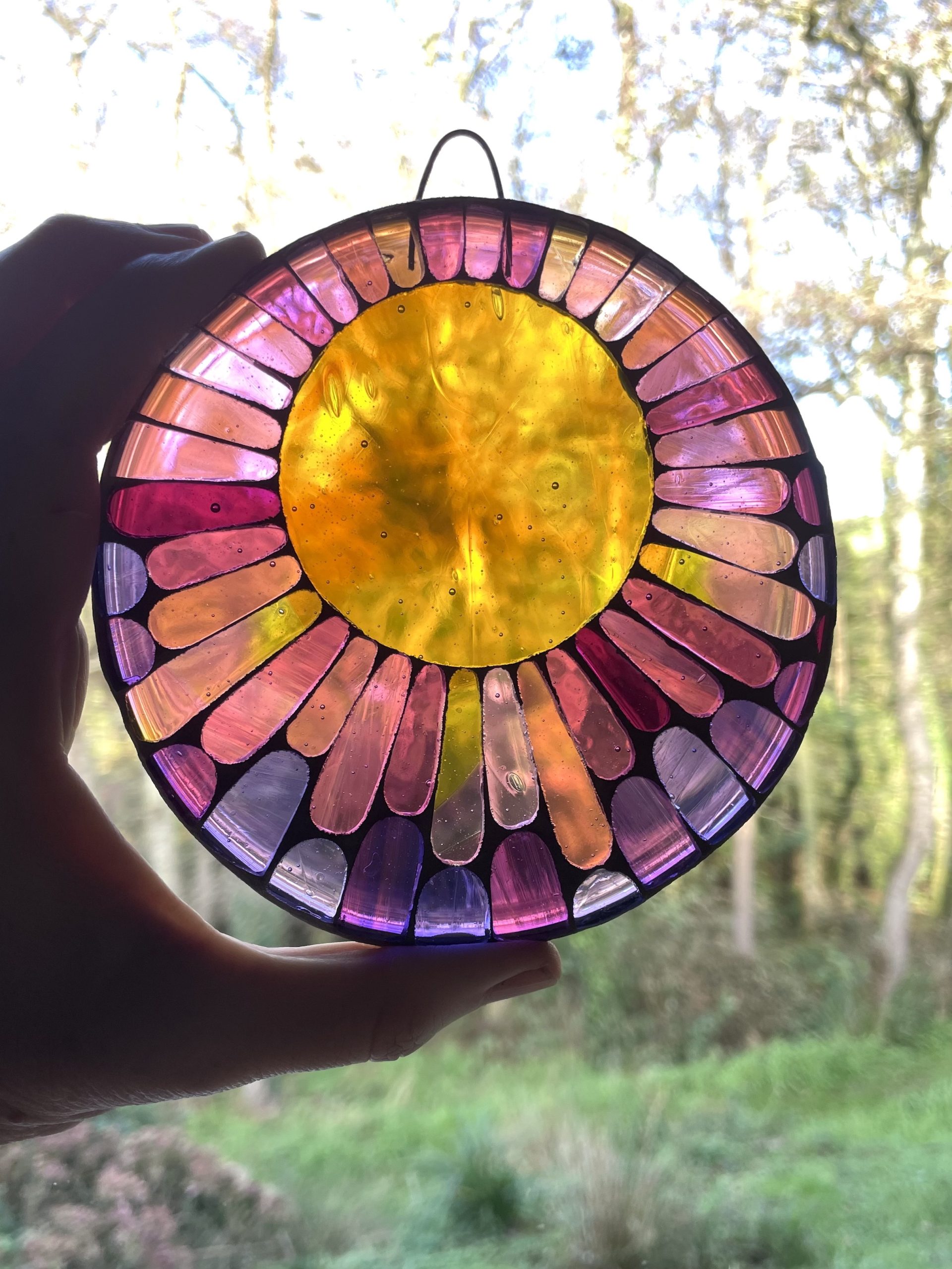 A hand-made stained glass mosaic circle in vibrant colours. Made with a combination of handmade, mouth-blown glass and machine made glass set in a radiating design.